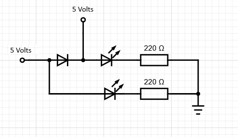 Conecta el siguiente circuito en tu protoboard, y alimenta de forma alternada, primero uno y luego el otro, las señales de 5 volts, observa y documenta que es lo que pasa con los leds y porque.