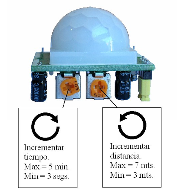 Potenciómetros: De acuerdo a la figura, el usuario puede ajustar tanto el tiempo de disparo de la señal de alarma de movimiento, como la distancia de detección. Los potenciómetros correspondientes deben girarse en la dirección mostrada para realizar los ajustes.