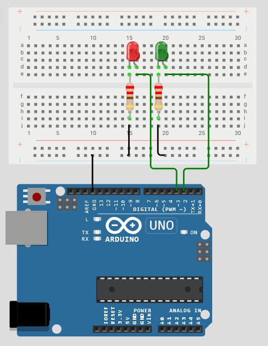 int led1 = 2; int led2 = 3; void setup() { pinMode(led1, OUTPUT); pinMode(led2, OUTPUT); } void loop() { // LED 1 encendido, LED 2 apagado digitalWrite(led1, HIGH); digitalWrite(led2, LOW); delay(1000); // 1 segundo // LED 1 apagado, LED 2 encendido digitalWrite(led1, LOW); digitalWrite(led2, HIGH); delay(1000); // 1 segundo }