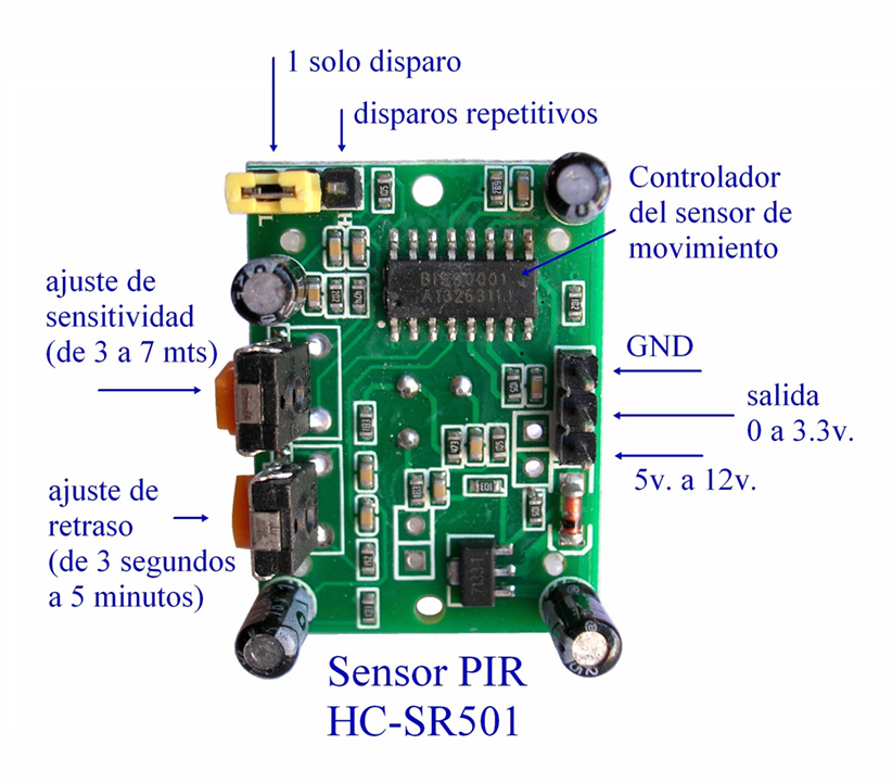El sensor PIR infrarrojo: En los sensores de movimiento, el sensor PIR consta en realidad de 2 elementos detectores separados, siendo la señal diferencial entre ambos la que permite activar la alarma de movimiento. En el caso del HC-SR501, la señal generada por el sensor ingresa al circuito integrado BISS0001, el cual contiene amplificadores operacionales e interfaces electrónicas adicionales.