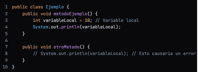 - Alcance: Solo es accesible dentro del método o bloque donde fue declarada. No se puede acceder a ella desde fuera de ese método.