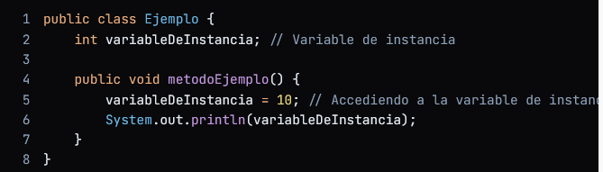- Alcance: Se puede acceder a ella desde cualquier método de la misma clase y, si es pública, también desde otras clases.