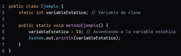 - Definición: Es una variable que se declara con la palabra clave static dentro de una clase. Pertenece a la clase en sí, no a una instancia específica.