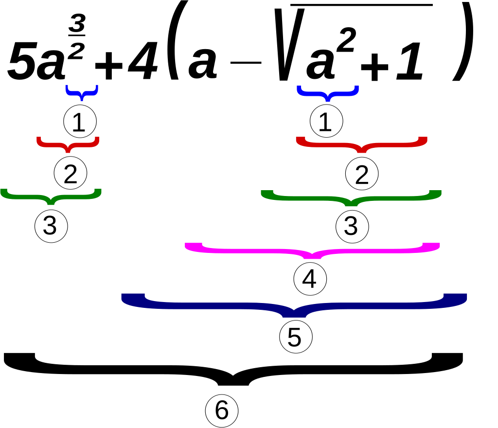 Por lo tanto, para forzar la precedencia de la adición respecto de la multiplicación, la expresión se anotaría como (2 + 3) × 4 =20, y para la precedencia de la adición respecto de la exponenciación,así: (3 + 5)^2 = 64