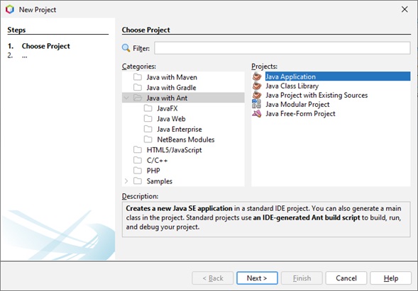Utilizamos la plantilla de Java With Ant y Java Aplication
