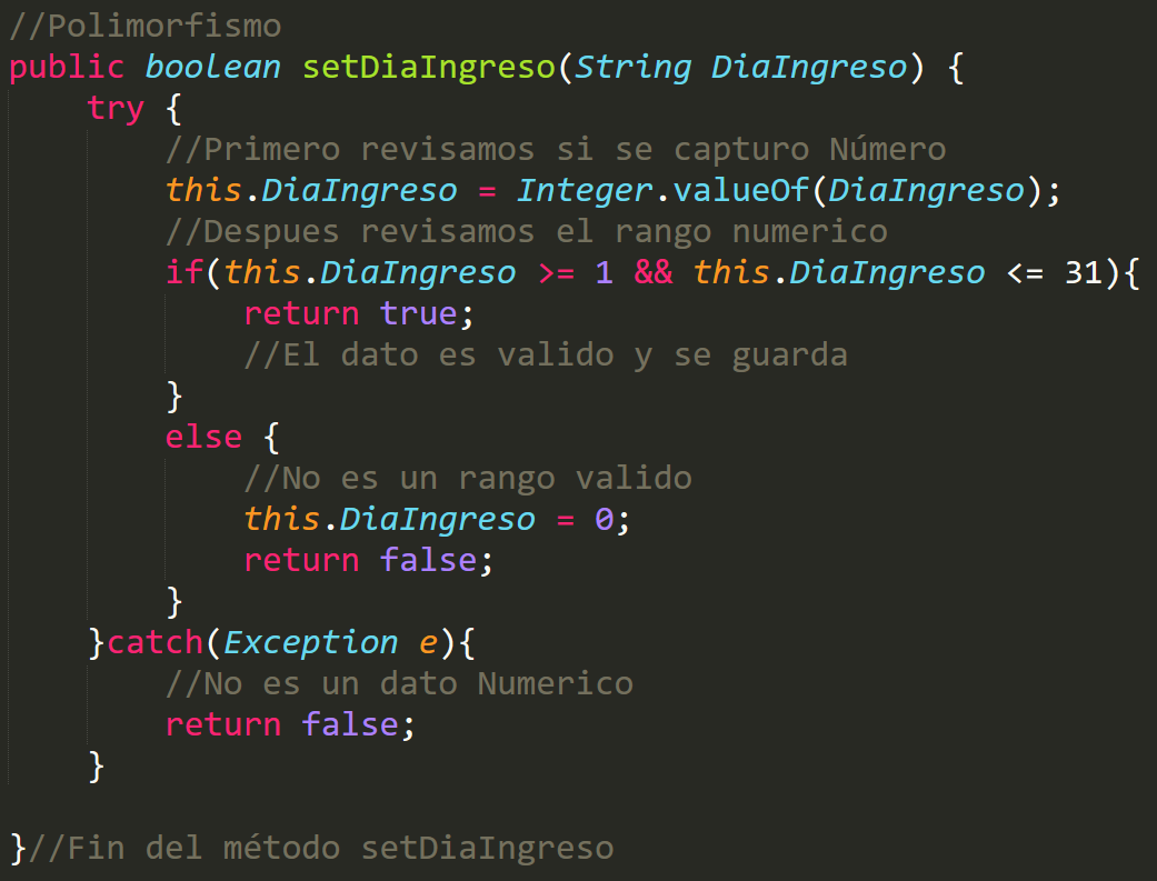 private int DiaIngreso; //Crear Set que reciba el parametro en String y vigile la conversión a entero y que solo permita el ingreso de números entre 1 a 31, y crear el Get