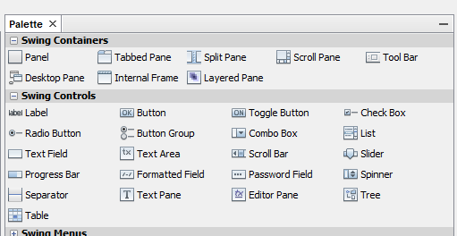 La biblioteca Swing tiene una sección visual de donde se pueden arrastrar y colocar varios componentes, y el código se genera automáticamente en la sección de source.