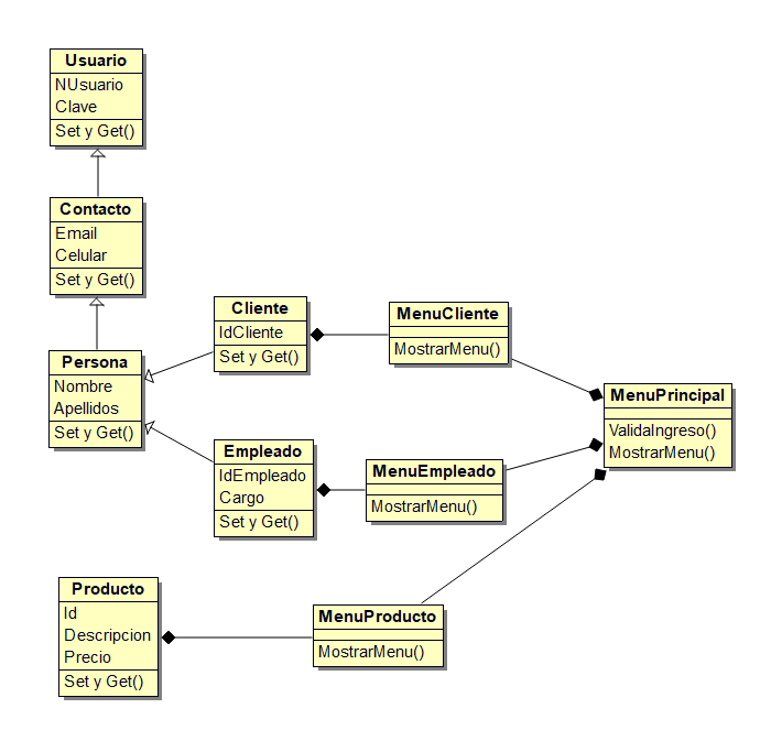 Código JAVA MenuPrincipal (MenuPrincipal.java) que instancia y administra objetos MenuProducto, MenuCliente, MenuEmpleado